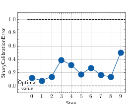 \[\text{ECE} = \sum_i^N b_i \|(p_i - c_i)\|, \text{L1 norm (Expected Calibration Error)}\]\[\text{MCE} = \max_{i} (p_i - c_i), \text{Infinity norm (Maximum Calibration Error)}\]\[\text{RMSCE} = \sqrt{\sum_i^N b_i(p_i - c_i)^2}, \text{L2 norm (Root Mean Square Calibration Error)}\]Where \(p_i\) is the top-1 prediction accuracy in bin \(i\), \(c_i\) is the average confidence of predictions in bin \(i\), and \(b_i\) is the fraction of data points in bin \(i\). Bins are constructed in an uniform way in the [0,1] range.
