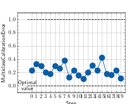 >>> from torch import randn, randint >>> # Example plotting a multiple values >>> from torchmetrics.classification import MulticlassCalibrationError >>> metric = MulticlassCalibrationError(num_classes=3, n_bins=3, norm='l1') >>> values = [] >>> for _ in range(20): ... values.append(metric(randn(20,3).softmax(dim=-1), randint(3, (20,)))) >>> fig_, ax_ = metric.plot(values)