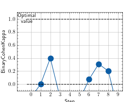 >>> from torch import rand, randint >>> # Example plotting multiple values >>> from torchmetrics.classification import BinaryCohenKappa >>> metric = BinaryCohenKappa() >>> values = [ ] >>> for _ in range(10): ... values.append(metric(rand(10), randint(2,(10,)))) >>> fig_, ax_ = metric.plot(values)