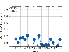 >>> from torch import randn, randint >>> # Example plotting a multiple values >>> from torchmetrics.classification import MulticlassCohenKappa >>> metric = MulticlassCohenKappa(num_classes=3) >>> values = [] >>> for _ in range(20): ... values.append(metric(randn(20,3).softmax(dim=-1), randint(3, (20,)))) >>> fig_, ax_ = metric.plot(values)