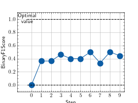 >>> from torch import rand, randint >>> # Example plotting multiple values >>> from torchmetrics.classification import BinaryF1Score >>> metric = BinaryF1Score() >>> values = [ ] >>> for _ in range(10): ... values.append(metric(rand(10), randint(2,(10,)))) >>> fig_, ax_ = metric.plot(values)