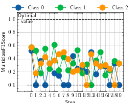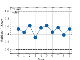 >>> from torch import rand, randint >>> # Example plotting multiple values >>> from torchmetrics.classification import MultilabelF1Score >>> metric = MultilabelF1Score(num_labels=3) >>> values = [ ] >>> for _ in range(10): ... values.append(metric(randint(2, (20, 3)), randint(2, (20, 3)))) >>> fig_, ax_ = metric.plot(values)