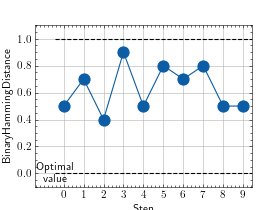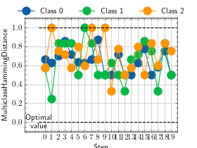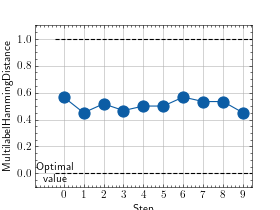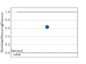 \[\text{Hamming distance} = \frac{1}{N \cdot L} \sum_i^N \sum_l^L 1(y_{il} \neq \hat{y}_{il})\]Where \(y\) is a tensor of target values, \(\hat{y}\) is a tensor of predictions, and \(\bullet_{il}\) refers to the \(l\)-th label of the \(i\)-th sample of that tensor.