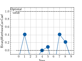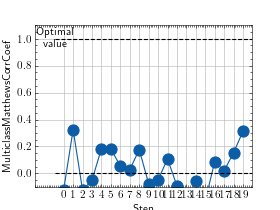 >>> from torch import rand, randint >>> # Example plotting multiple values >>> from torchmetrics.classification import BinaryMatthewsCorrCoef >>> metric = BinaryMatthewsCorrCoef() >>> values = [ ] >>> for _ in range(10): ... values.append(metric(rand(10), randint(2,(10,)))) >>> fig_, ax_ = metric.plot(values)