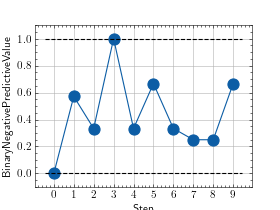 >>> from torch import rand, randint >>> # Example plotting multiple values >>> from torchmetrics.classification import BinaryNegativePredictiveValue >>> metric = BinaryNegativePredictiveValue() >>> values = [ ] >>> for _ in range(10): ... values.append(metric(rand(10), randint(2,(10,)))) >>> fig_, ax_ = metric.plot(values)
