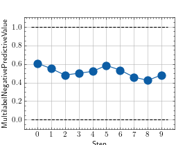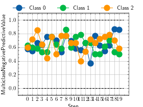 >>> from torch import rand, randint >>> # Example plotting multiple values >>> from torchmetrics.classification import MultilabelNegativePredictiveValue >>> metric = MultilabelNegativePredictiveValue(num_labels=3) >>> values = [ ] >>> for _ in range(10): ... values.append(metric(randint(2, (20, 3)), randint(2, (20, 3)))) >>> fig_, ax_ = metric.plot(values)