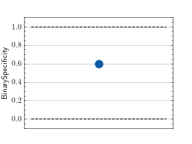 \[\text{Specificity} = \frac{\text{TN}}{\text{TN} + \text{FP}}\]Where \(\text{TN}\) and \(\text{FP}\) represent the number of true negatives and false positives respectively. The metric is only proper defined when \(\text{TN} + \text{FP} \neq 0\). If this case is encountered a score of 0 is returned.