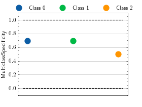 >>> from torch import randint >>> # Example plotting a single value per class >>> from torchmetrics.classification import MulticlassSpecificity >>> metric = MulticlassSpecificity(num_classes=3, average=None) >>> metric.update(randint(3, (20,)), randint(3, (20,))) >>> fig_, ax_ = metric.plot()