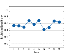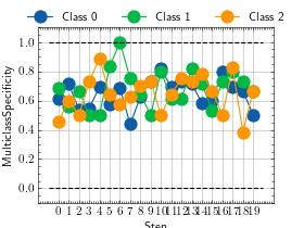 >>> from torch import rand, randint >>> # Example plotting multiple values >>> from torchmetrics.classification import MultilabelSpecificity >>> metric = MultilabelSpecificity(num_labels=3) >>> values = [ ] >>> for _ in range(10): ... values.append(metric(randint(2, (20, 3)), randint(2, (20, 3)))) >>> fig_, ax_ = metric.plot(values)