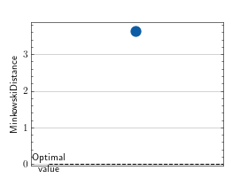 \[\begin{split}d_{\text{Minkowski}} = \\sum_{i}^N (| y_i - \\hat{y_i} |^p)^\frac{1}{p}\end{split}\]This metric can be seen as generalized version of the standard euclidean distance which corresponds to minkowski distance with p=2.